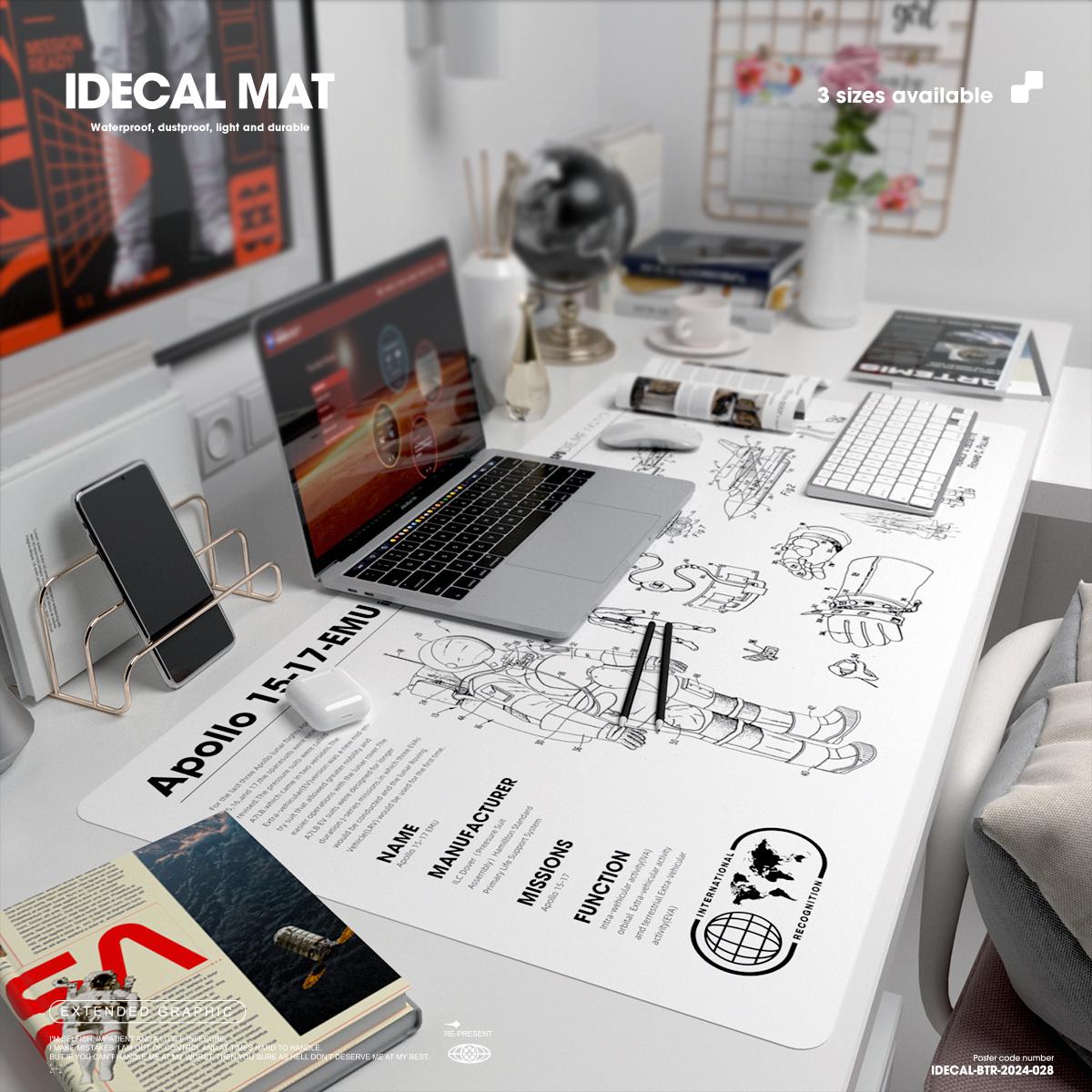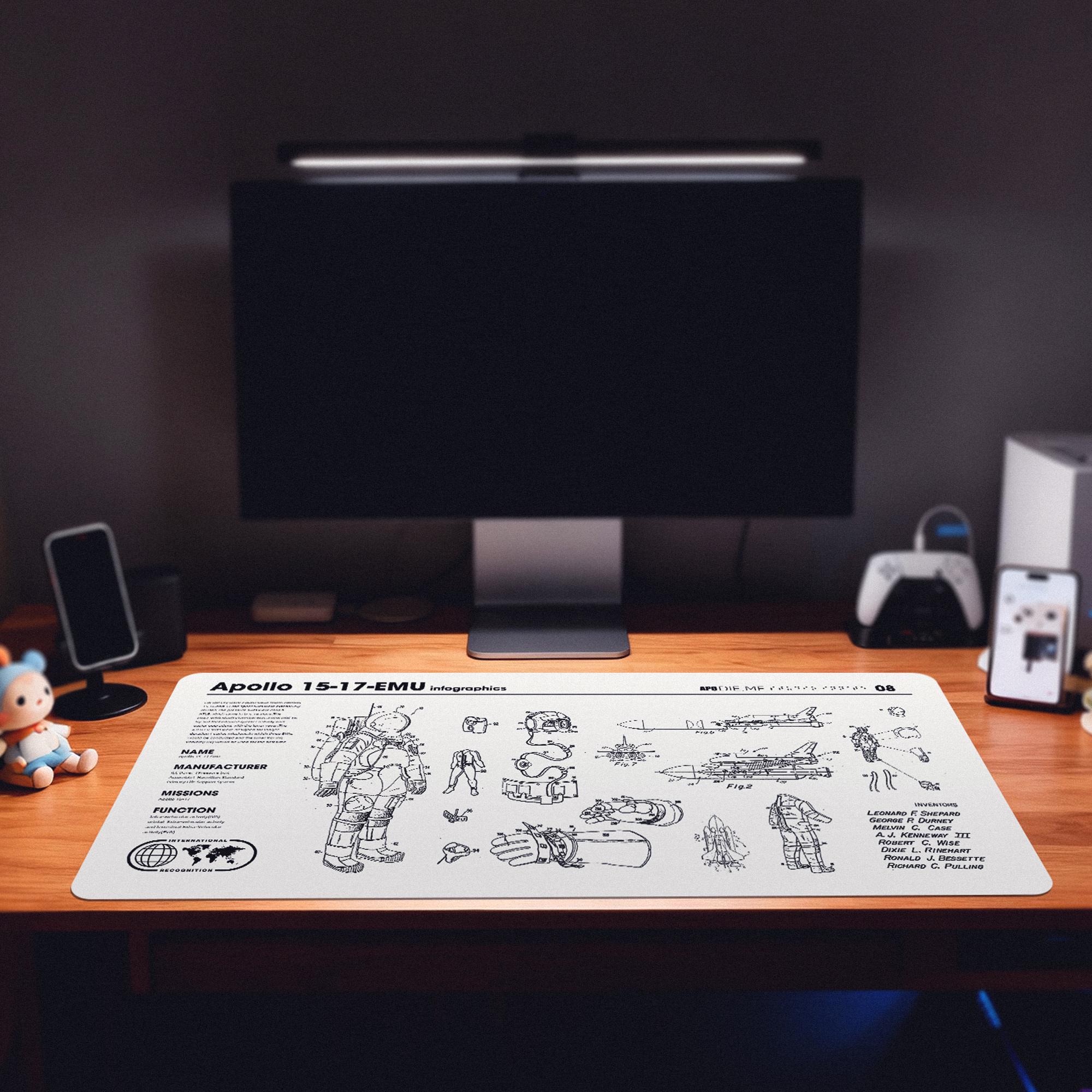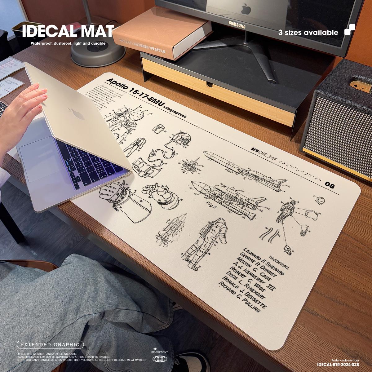 Astronaut Desk Mat: Apollo Infographics, Waterproof PU Leather Thin leather desk pad, Soft office mat, White leather desk cover
