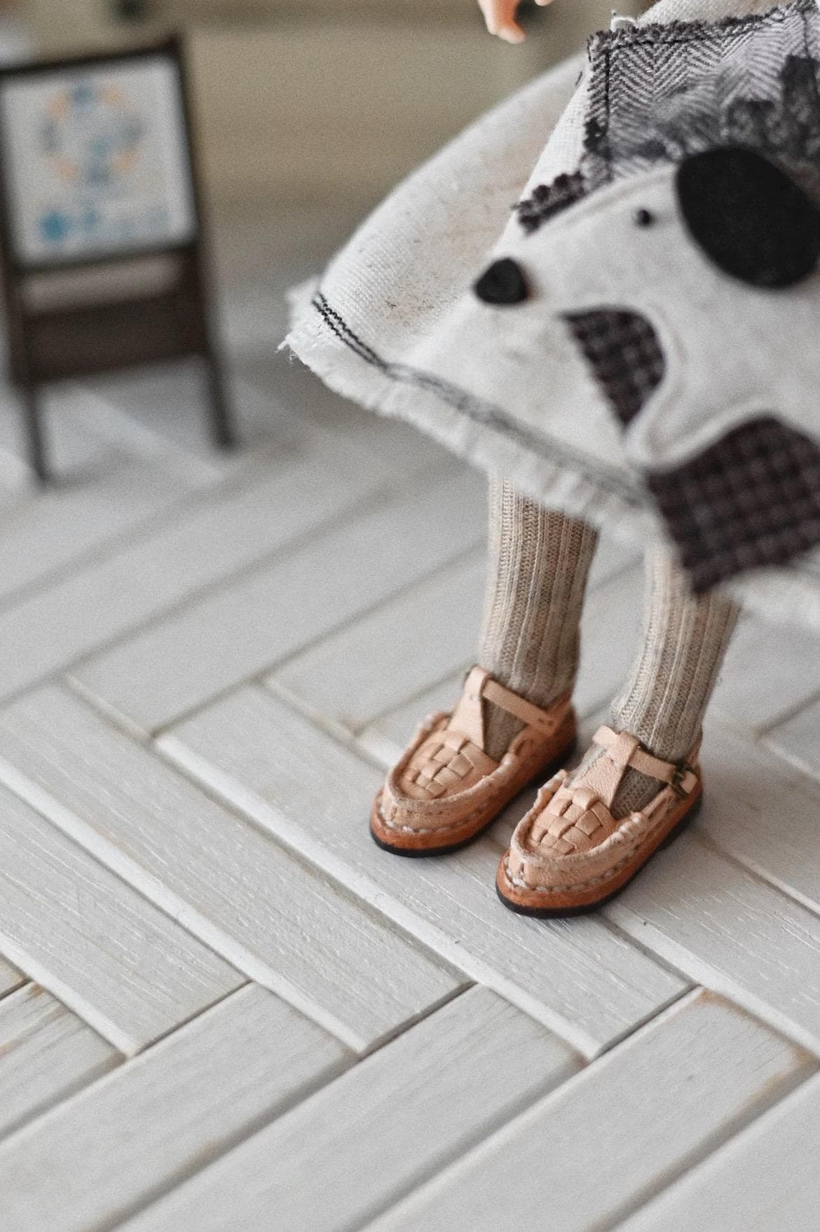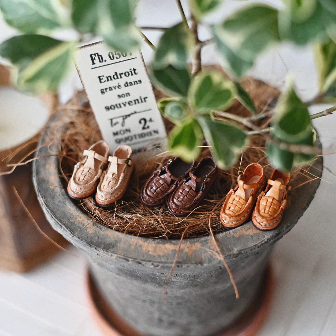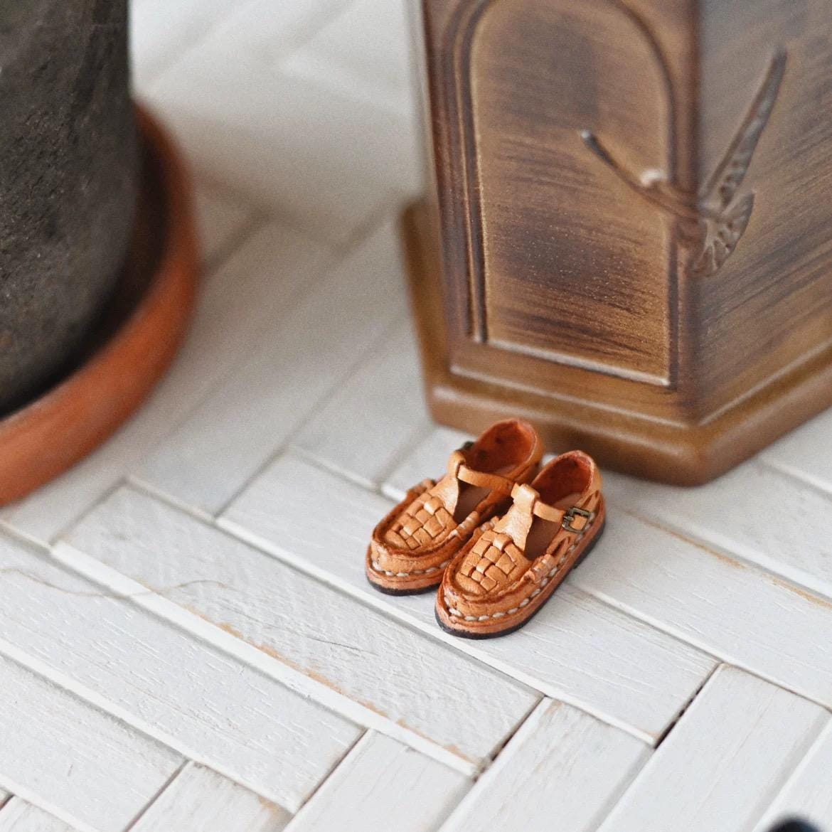 Discover the exquisite craftsmanship of these handmade genuine leather doll shoes, featuring a beautiful woven design and elegant T-strap styling. These miniature shoes showcase artisanal detail with their intricate textured pattern and sophisticated fixed buckle closure.